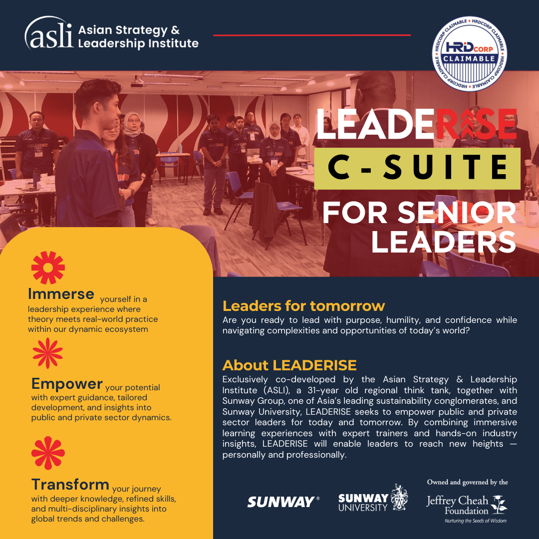 LEADERISE: C-Suite is an advanced leadership development experience designed for senior executives navigating complex strategic and people leadership responsibilities. This program empowers leaders to drive enterprise-wide impact with clarity, empathy, and influence—equipping them with future-ready capabilities to accelerate performance and foster collaborative growth across diverse business units.